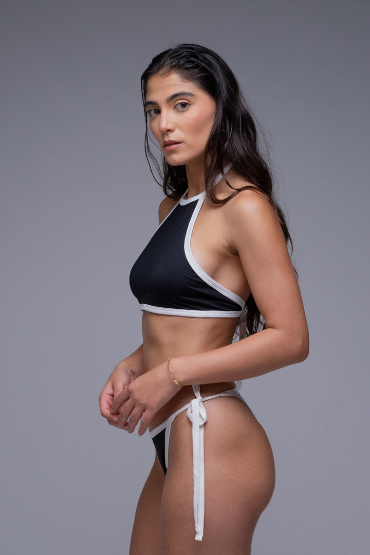 Top de vestido de baño halter bicolor, diseñado para un estilo fresco y moderno. Su combinación de negro y crema crea un look atrevido pero versátil, ideal para resaltar en la playa o la piscina. Con tirantes al cuello y materiales de secado rápido, es perfecto para disfrutar de días soleados con comodidad y mucho estilo. Combínalo con tus prendas favoritas para crear outfits únicos.