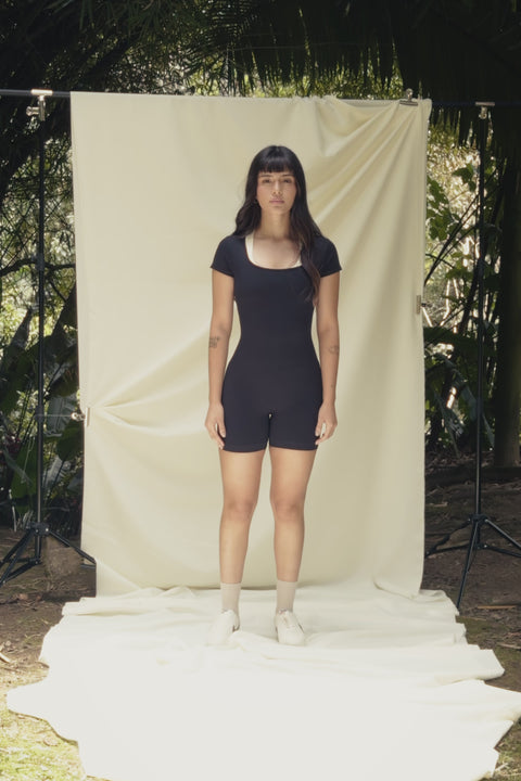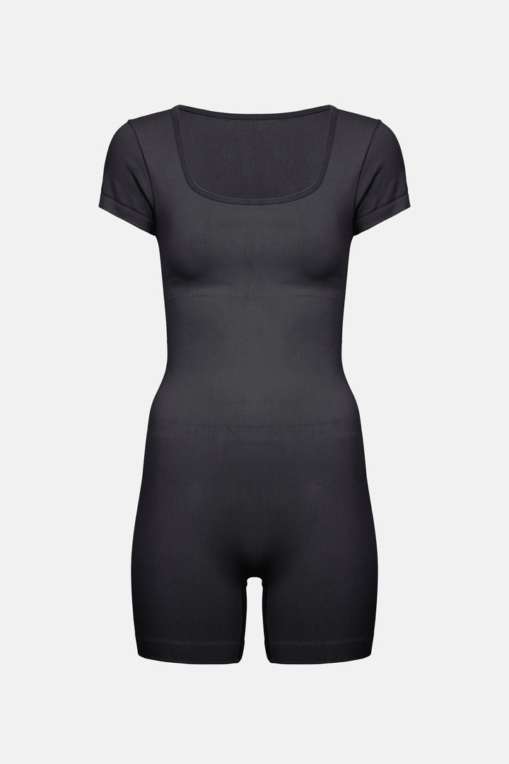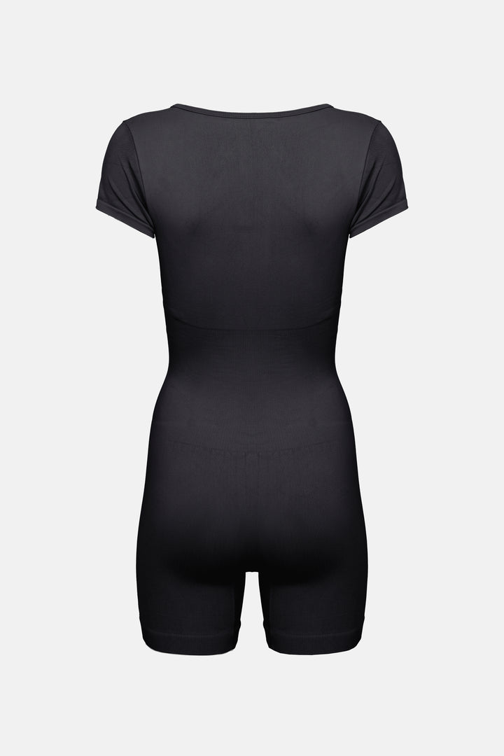 El escote cuadrado aporta un aire sofisticado, mientras que el corte tipo short a media pierna lo convierte en una prenda versátil, ideal tanto para entrenamientos, yoga o como pieza urbana para un look moderno y atrevido.