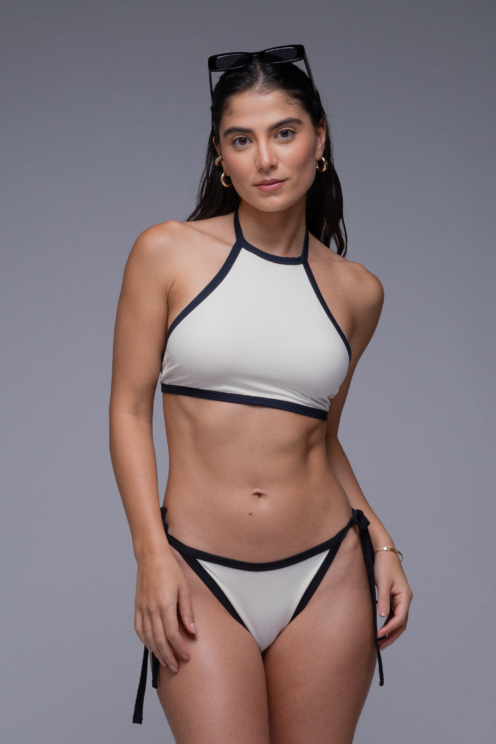Top de vestido de baño halter bicolor, diseñado para un estilo fresco y moderno. Su combinación de negro y crema crea un look atrevido pero versátil, ideal para resaltar en la playa o la piscina. Con tirantes al cuello y materiales de secado rápido, es perfecto para disfrutar de días soleados con comodidad y mucho estilo. Combínalo con tus prendas favoritas para crear outfits únicos.