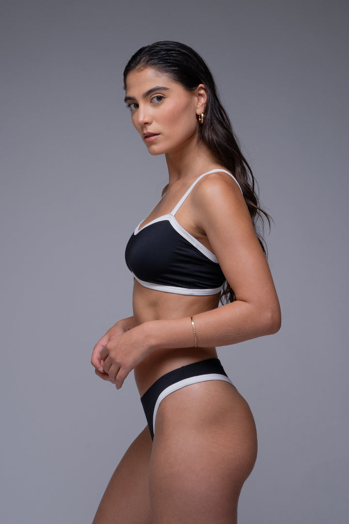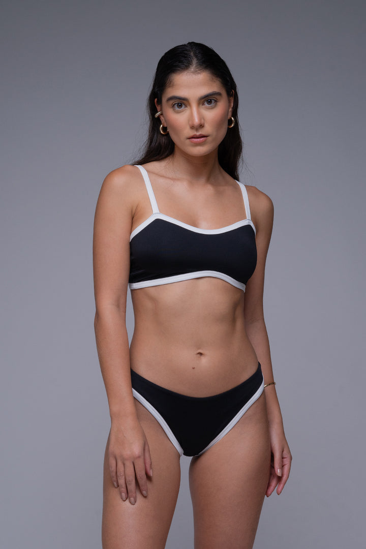Top de vestido de baño en color negro con detalles en blanco, diseñado para ofrecer un equilibrio perfecto entre estilo y funcionalidad. Este top cuenta con un diseño cómodo y elegante, ideal para disfrutar de días soleados en la playa o en la piscina. Los tirantes delgados brindan un ajuste seguro y favorecen una silueta sofisticada, mientras que el ribete blanco resalta el contraste clásico y moderno.
