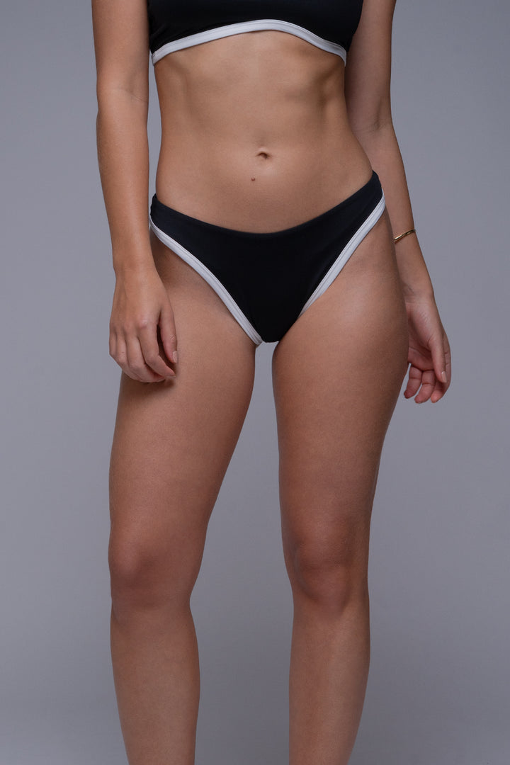 Dale un toque moderno a tus días de playa con este panty bikini en diseño bicolor. Su tono marfil con bordes negros crea un contraste elegante y minimalista, perfecto para un look fresco y chic. Con un corte de tiro medio y ajuste cómodo, esta pieza es ideal para combinar con el top de bikini a juego o con otras prendas de tu colección. Fabricada en poliamida y elastano de alta calidad, ofrece suavidad, elasticidad y durabilidad, garantizando tu confort en todo momento.