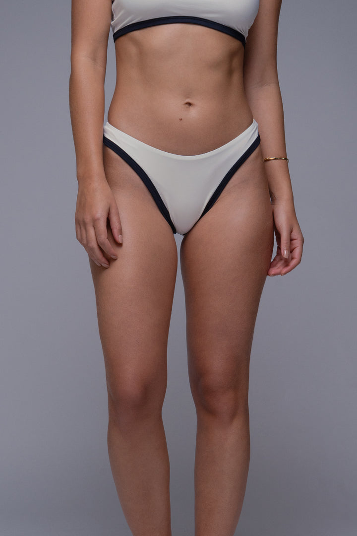 Dale un toque moderno a tus días de playa con este panty bikini en diseño bicolor. Su tono marfil con bordes negros crea un contraste elegante y minimalista, perfecto para un look fresco y chic. Con un corte de tiro medio y ajuste cómodo, esta pieza es ideal para combinar con el top de bikini a juego o con otras prendas de tu colección. Fabricada en poliamida y elastano de alta calidad, ofrece suavidad, elasticidad y durabilidad, garantizando tu confort en todo momento.